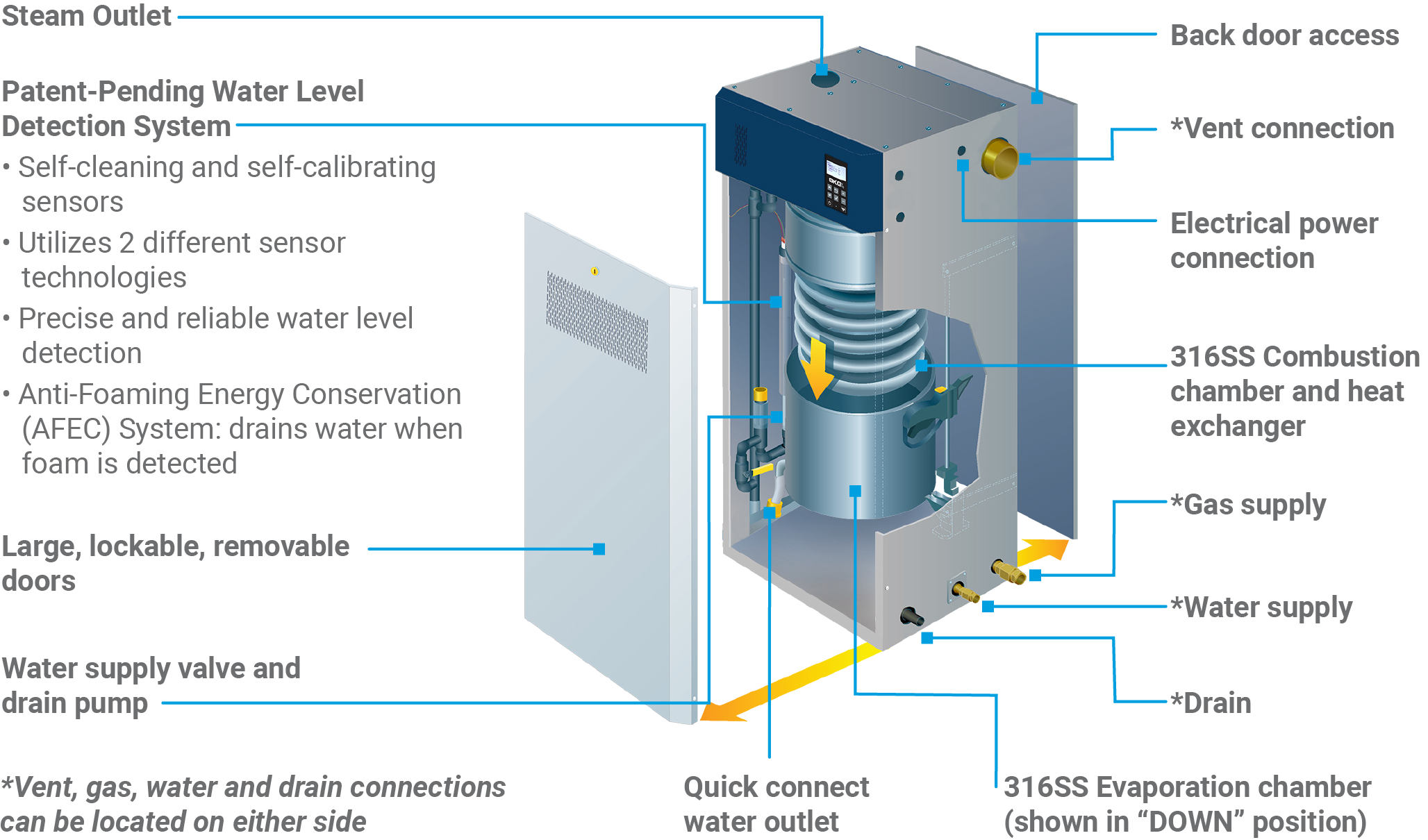• Fully Modulating, ranging from 4.5kg/hr to maximum