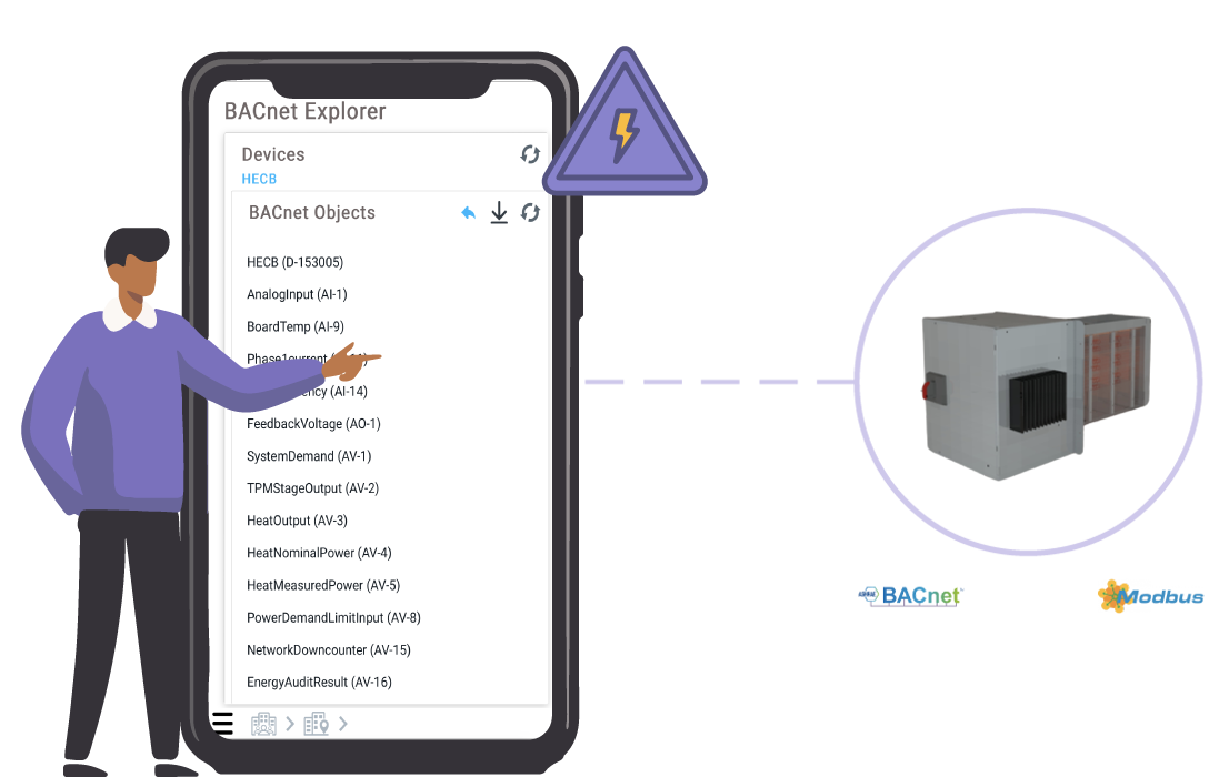 Equipped with current transducers in BACnet heaters, the app displays real-time power consumption data. It also features configurable alerts based on consumption profiles, helping manage energy use more effectively and improve overall facility efficiency.